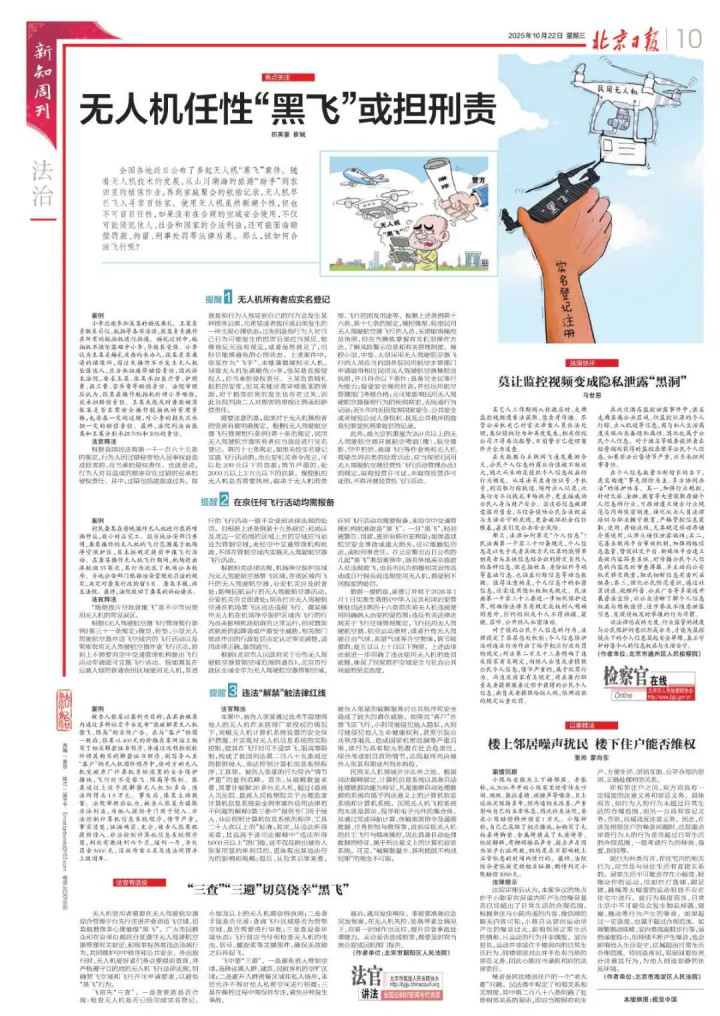 根据《北京市人民政府关于公布无人驾驶航空器管制空域范围的通告》,北京市行政区全域全年为无人驾驶航空器管制空域,任何飞行活动均需要报备,未经空中交通管理机构批准就是“黑飞”。一旦“黑飞”,轻则被警告、罚款,重则面临治安拘留;如果造成航空安全事故或重大损失,还可能触犯刑法,承担刑事责任。在北京警方近日公布的几起“黑飞”典型案例中,既有外地来京旅游人员违规放飞,也有市民为拍摄相关宣传活动或自行娱乐而违规使用无人机,都受到不同程度的处罚。